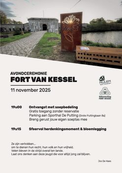 Op 11 november 1918 zwegen vanaf 11 uur eindelijk de wapens. Enkele jaren voordien, bij het begin van de eerste wereldoorlog, moest het fort in Kessel na zware beschietingen de strijd staken. Op 4 oktober 1914, toevallig ook om 11 uur, wordt duidelijk dat het fort niet meer te verdedigen is. Het is dus zeer toepasselijk dat we daar op de avond van 11 november 2025, 107 jaar na de wapenstilstand, even bij stilstaan.