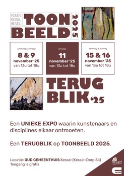 Terugblik ’25 is een unieke expo in het Oud Gemeentehuis in het centrum van Kessel. Je kan er op 8,9, 11, 15 en 16 november gratis naar lokaal werk van verschillende disciplines gaan kijken. 36 lokale kunstenaars en enkele fotografen stellen samen 44 werken tentoon. Werken die niet aan bod kwamen tijdens Toonbeeld ’25 of werken die je misschien toen gemist hebt, maar ook nieuw werk, je kan het zelf gaan ontdekken. Tegelijk zetten we het Oud Gemeentehuis in Kessel in de kijker als mooi decor voor tentoonstellingen.